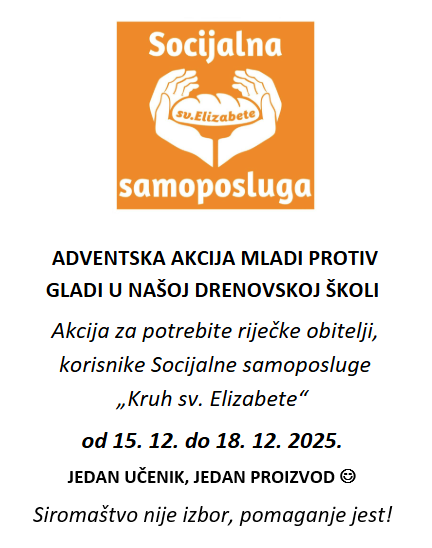 Ovaj tjedan skupljamo prehrambene trajne proizvode i higijenske potrepštine za riječku Socijalnu samoposlugu. Sve prikupljeno molim da ostavljate u malom kabinetu razredne nastave.