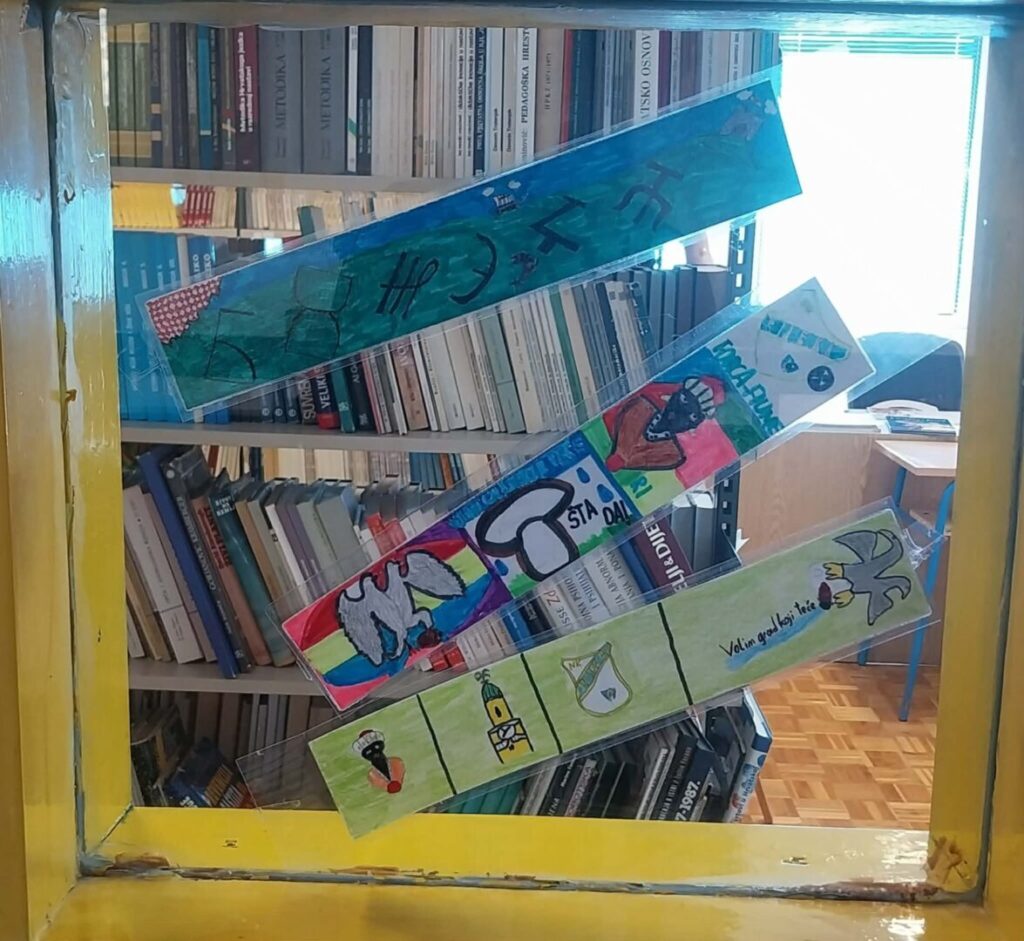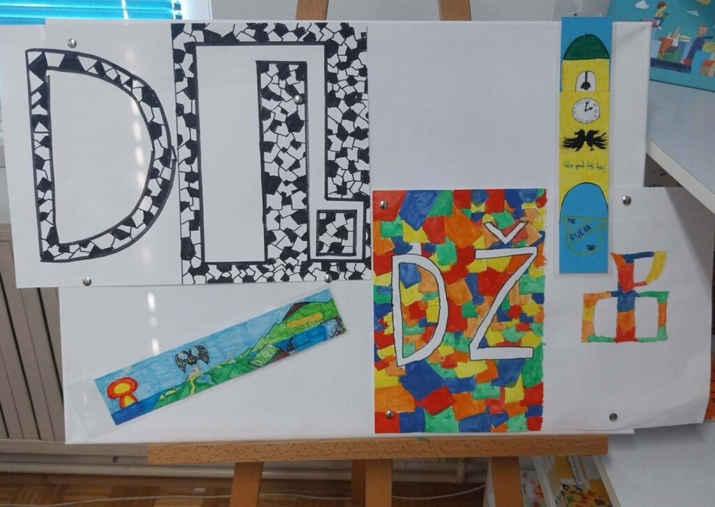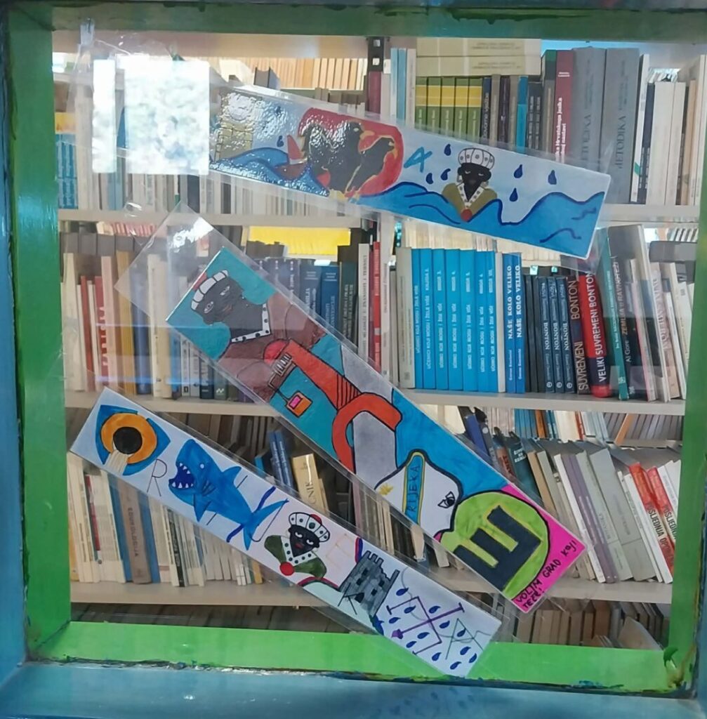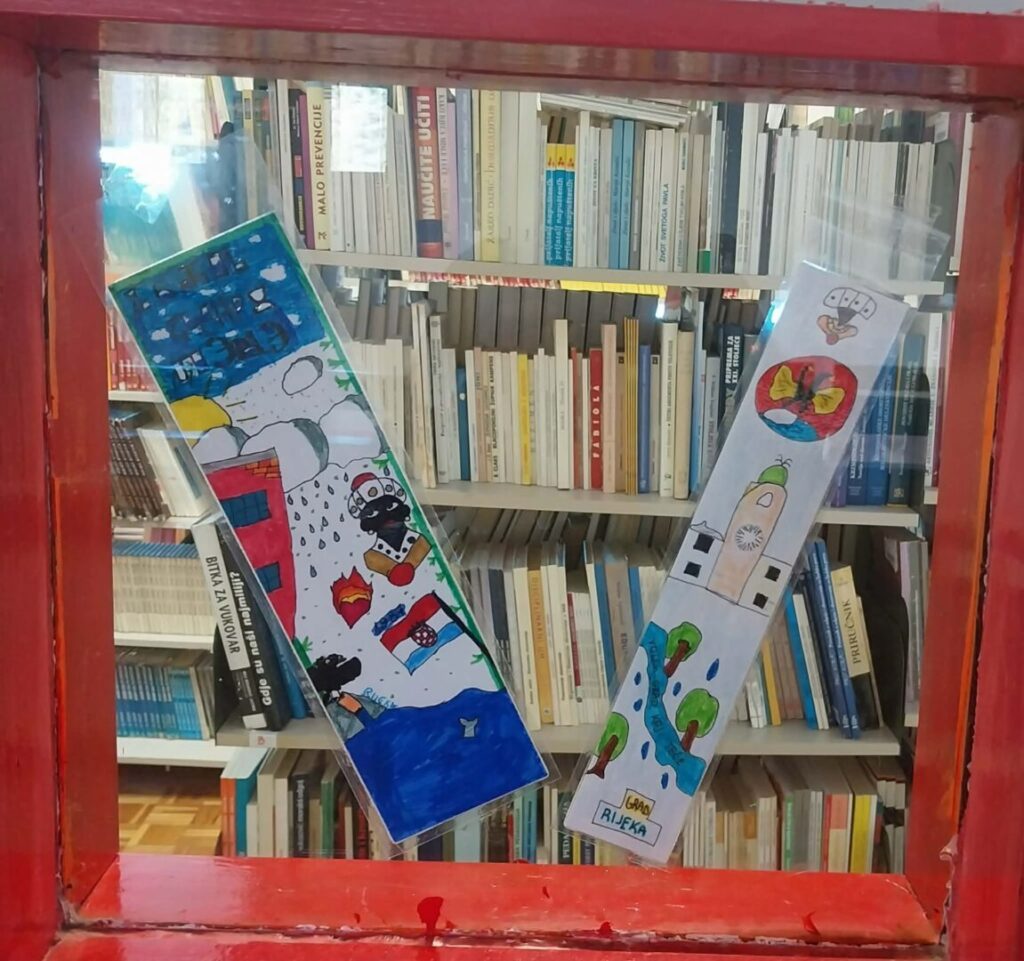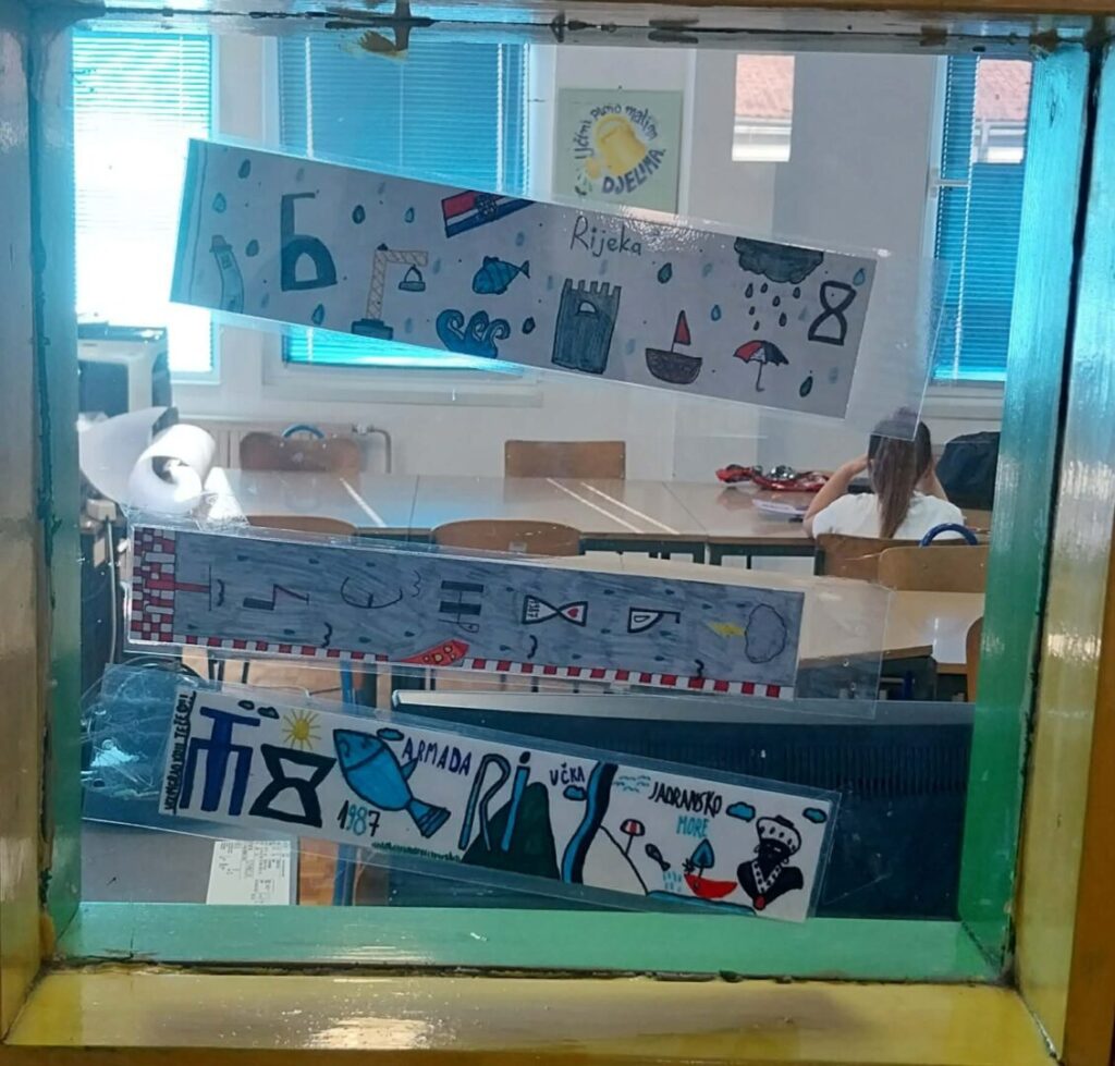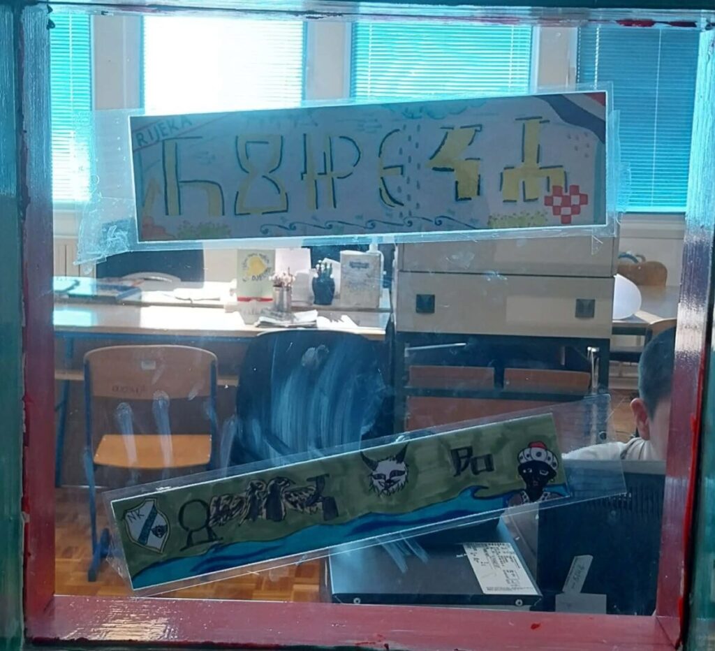 Na izložbu pozivaju kreativni straničnici na kojima su spojeni motivi grada Rijeke s glagoljskim slovima, a koji su izloženi na staklenim pregradama školske knjižnice.