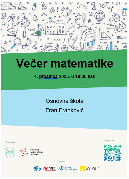 Dragi učenici i dragi roditelji, pridružite nam se na Večeri matematike koja će se održati u četvrtak, 4. prosinca 2025. od 18.00 do 20.00. Večer matematike otkriva zabavnu stranu matematike, stvara nove ideje, potiče izgradnju pozitivnog stava učenika prema matematici.